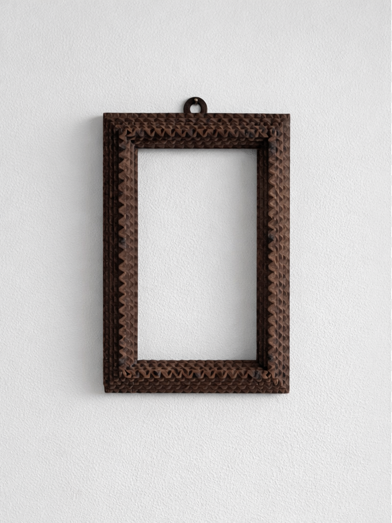 A small tramp art frame from around 1900. Dimensions: 22 x 15,7 cm (outer); 16,8 x 10,8 cm (fold); 15,8 x 9,8 cm (inner).